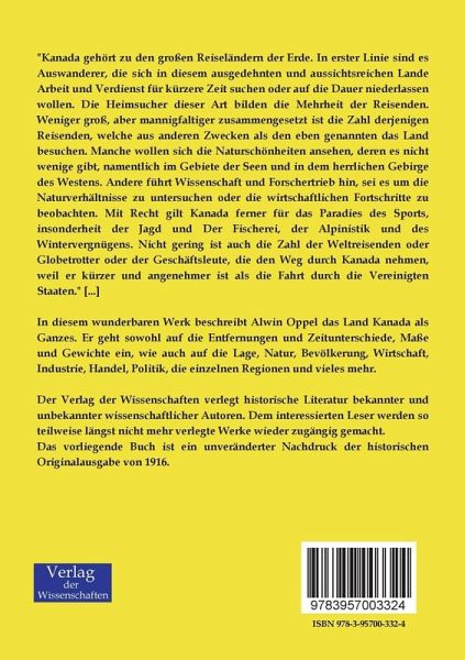 In diesem wunderbaren Werk beschreibt Alwin Oppel das Land Kanada als Ganzes. Er geht sowohl auf die Entfernungen und Zeitunterschiede, Maße und Gewichte ein, wie auch auf die Lage, Natur, Bevölkerung, Wirtschaft, Industrie, Handel, Politik, die einzelnen Regionen und vieles mehr.