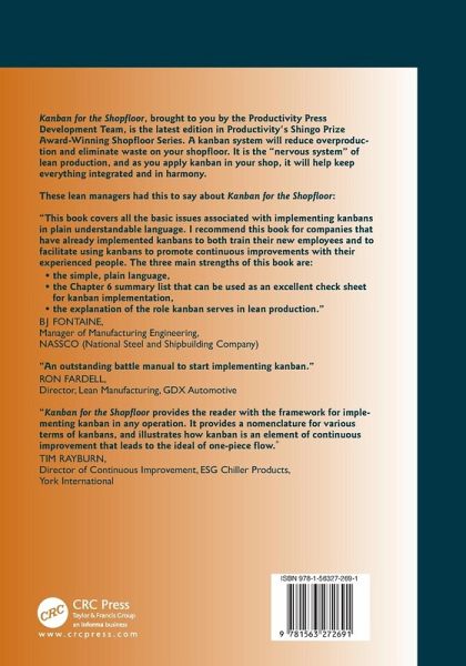 Kanban is the name given to the inventory control card used in a pull system. The primary benefit of kanban is to reduce overproduction, the worst of the seven deadly wastes. A true kanban system produces exactly what is ordered, when it is ordered, and in the quantities ordered. Kanban for the Shopfloor provides a working manual for those seeking to implement this method of production control in any operation. It defines the various terms and methods employed in kanbans, and illustrates how when adhered to, kanban is an element of continuous improvement that ultimately leads to the ideal of one-piece flow."…mehr
