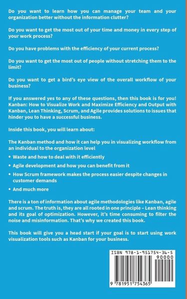 Do you want to learn how you can manage your team and your organization better without the information clutter? Do you want to get the most out of your time and money in every step of your work process? Do you have problems with the efficiency of your current process? Do you want to get the most out of people without stretching them to the limit? Do you want to get a bird's eye view of the overall workflow of your business? If you answered yes to any of these questions, then this book is for you! Kanban: How to Visualize Work and Maximize Efficiency and Output with Kanban, Lean Thinking, Scrum, and Agile provides solutions to issues that hinder you to have a successful business. Inside this book, you will discover:The Kanban method and how it can help you in visualizing workflow from an individual to the organization level Waste and how to deal with it efficiently Agile development and how you can benefit from it How Scrum framework makes the process easier despite changes in customer demands And much more There is a ton of information about agile methodologies like Kanban, agile and scrum. The truth is, they are all rooted in one principle - Lean thinking and its goal of optimization. However, it's time consuming to filter the noise and misinformation. That's why we created this book. This book will give you a head start if your goal is to start using work visualization tools such as Kanban for your business. The methods discussed in this book have been proven effective for several businesses, and learning about them might just give you an advantage over your competitors who have yet to adopt to this kind of thinking. Kanban: How to Visualize Work and Maximize Efficiency and Output with Kanban, Lean Thinking, Scrum, and Agile can help you face issues that many companies are bound to face, and ultimately lead your business to success.Click "Buy Now" and get started today!