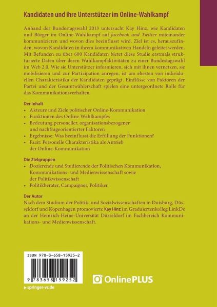 Anhand der Bundestagswahl 2013 untersucht Kay Hinz, wie Kandidaten und Bürger im Online-Wahlkampf auf facebook und Twitter miteinander kommunizieren und wovon dies beeinflusst wird. Ziel ist es, herauszufinden, wovon Kandidaten in ihrem kommunikativen Handeln geleitet werden. Mit Befunden zu über 600 Kandidaten bietet diese Studie erstmals strukturierte Daten über deren Wahlkampfaktivitäten zu einer Bundestagswahl im Web 2.0. Wie sie Unterstützer informieren, sich mit ihnen vernetzen, sie mobilisieren und zur Partizipation anregen, ist am ehesten von individuellen Charakteristika der Kandidaten geprägt. Einflüsse von Faktoren der Partei und der Gesamtwählerschaft spielen eine untergeordnete Rolle für das Kommunikationsverhalten.