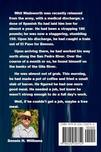 Recently released from the army, with a medical discharge, Whit Wadsworth was, after a dose of Spanish flu had laid him low for almost a year. Where he had been a strapping 180 pounds, he was now a staggering, stumbling 150. Upon his discharge, he had caught a train out of El Paso for Benson. Upon arriving there, he had worked his way north along the San Pedro River. Over the course of a month or so, he found himself on the banks of the Gila River. He was almost out of grub. This morning, he had made a pot of coffee and fried a small slab of bacon. He figured he had one more good meal. He needed a job, but knew he wasn't strong enough to do a full day's work. Well, if he couldn't get a job, maybe a free meal. As he reached the top of the mountain, he saw below him, a house and barn with corrals. As he rode closer, he could see a woman dressed in a denim shirt over a pair of split riding skirts. They fell to the top of shop-made calfskin boots. The woman's hair had once been a honey blonde, but was now showing a little gray, at middle age she still held a fair figure and a face with no wrinkles. But above all that, Whit was worried, for strapped around her waist was a pistol. A lump came to his throat as he approached. He fairly needed a meal and a place to sleep, but this ranch woman looked hard as nails. He stopped twenty feet from the house and removed his hat. "Good afternoon Ma'am, is your man about?" "No, I don't have a man. Not anymore, he's buried over in Globe. This is my ranch. What can I do for you?" She wasn't unpleasant, but still had a firm tone to her. "I'm just out of the army, looking for a job. I've come a fair piece. Would ya have anything a man could do for a meal?" Whit was leaning on his saddle horn while he spoke.