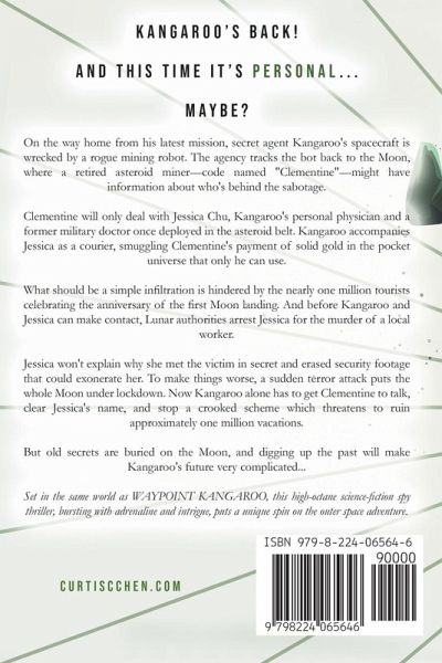 Kangaroo's back! And this time it's personal... Maybe? On the way home from his latest mission, secret agent Kangaroo's spacecraft is wrecked by a rogue mining robot. The agency tracks the bot back to the Moon, where a retired asteroid miner-code named "Clementine"-might have information about who's behind the sabotage. Clementine will only deal with Jessica Chu, Kangaroo's personal physician and a former military doctor once deployed in the asteroid belt. Kangaroo accompanies Jessica as a courier, smuggling Clementine's payment of solid gold in the pocket universe that only he can use. What should be a simple infiltration is hindered by the nearly one million tourists celebrating the anniversary of the first Moon landing. And before Kangaroo and Jessica can make contact, Lunar authorities arrest Jessica for the murder of a local worker. Jessica won't explain why she met the victim in secret and erased security footage that could exonerate her. To make things worse, a sudden terror attack puts the whole Moon under lockdown. Now Kangaroo alone has to get Clementine to talk, clear Jessica's name, and stop a crooked scheme which threatens to ruin approximately one million vacations. But old secrets are buried on the Moon, and digging up the past will make Kangaroo's future very complicated... Set in the same world as WAYPOINT KANGAROO, this high-octane science-fiction spy thriller, bursting with adrenaline and intrigue, puts a unique spin on the outer space adventure.
