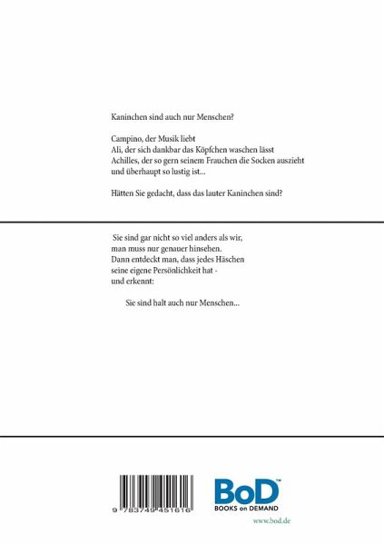 Kaninchen sind auch nur Menschen?Campino, der Musik liebtAli, der sich dankbar das Köpfchen waschen lässtAchilles, der so gern seinem Frauchen die Socken auszieht und überhaupt so lustig ist ...Hätten Sie gedacht, dass das lauter Kaninchen sind?Sie sind gar nicht so viel anders als wir, man muss nur genauer hinsehen.Dann entdeckt man, dass jedes Häschen seine eigene Persönlichkeit hatund erkennt: - Sie sind halt auch nur Menschen -