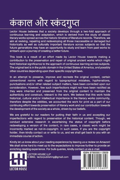 Kankaal Aur Skandgupt This book is a result of an effort made by us towards making a contribution to the preservation and repair of original classic literature. In an attempt to preserve, improve and recreate the original content, we have worked towards: 1. Type-setting & Reformatting: The complete work has been re-designed via professional layout, formatting and type-setting tools to re-create the same edition with rich typography, graphics, high quality images, and table elements, giving our readers the feel of holding a 'fresh and newly' reprinted and/or revised edition, as opposed to other scanned & printed (Optical Character Recognition - OCR) reproductions. 2. Correction of imperfections: As the work was re-created from the scratch, therefore, it was vetted to rectify certain conventional norms with regard to typographical mistakes, hyphenations, punctuations, blurred images, missing content/pages, and/or other related subject matters, upon our consideration. Every attempt was made to rectify the imperfections related to omitted constructs in the original edition via other references. However, a few of such imperfections which could not be rectified due to intentional\unintentional omission of content in the original edition, were inherited and preserved from the original work to maintain the authenticity and construct, relevant to the work. We believe that this work holds historical, cultural and/or intellectual importance in the literary works community, therefore despite the oddities, we accounted the work for print as a part of our continuing effort towards preservation of literary work and our contribution towards the development of the society as a whole, driven by our beliefs. We are grateful to our readers for putting their faith in us and accepting our imperfections with regard to preservation of the historical content. HAPPY READING!