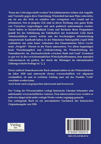 Dieses äußerst bemerkenswerte Buch entstand mitten in der Wirtschaftskrise im Jahre 1920 und untersucht ebenso wissenschaftlich wie allgemein verständlich, ob und in welchem Umfang man auf das Produkt "Geld" verzichtet werden kann.