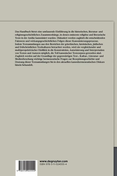 This handbook provides a comprehensive introduction into the interrelated circumstances in history and in the history of literature and religion which led to the canonization of eminent literary and religious texts in Antiquity. At the same time, it discusses the key factors and reasons for these canonization processes and the resulting historical consequences. Due to the selection of different collections of texts from Greek, Latin, Jewish and Early Christian text culture, the book offers a comparative and multi-perspective insight into the construction, authorization and interpretation of texts and authors that became part of the canonized corpus of texts. Important hermeneutic questions about the history of the reception and interpretation of these collections of texts are discussed on the basis of modern text research and research on culture, literature and the mediaâ?? up to the current discourse on canon hermeneutics.