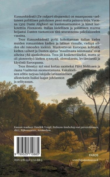 Kansankielestä (De vulgari eloquentia) on maanpaossa vaeltaneen poliittisen pakolaisen pieni mutta painava kirja. Vuonna 1302 Dante Alighieri sai kuolemantuomion ja hänet karkotettiin Firenzestä. Italian kielellinen ja poliittinen murros heijastui Danten tuotantoon tätä seuranneina pakolaisuuden vuosina. Teos Kansankielestä pyrki kohottamaan italian kielen muiden romaanisten kielten ja latinan rinnalle, vieläpä niiden ohi runouden kielenä. Muotoutuvan Euroopan kohtalot, kielten vaiheet ja Danten ajatus "maailmasta isänmaana" ovat aiheina yhä ajankohtaisia. Teos jäi keskeneräiseksi, mutta se oli pioneerityö kielten synnystä, olemuksesta, leviämisestä ja käytöstä Euroopassa. Teos ilmestyy nyt ensi kertaa suomeksi Päivi Mehtosen ja Jaana Vaahteran suomentamana. Kaksikielinen editio tarjoaa lukijalle latinankielisen alkutekstin lisäksi laajan johdannon ja selitysosan.