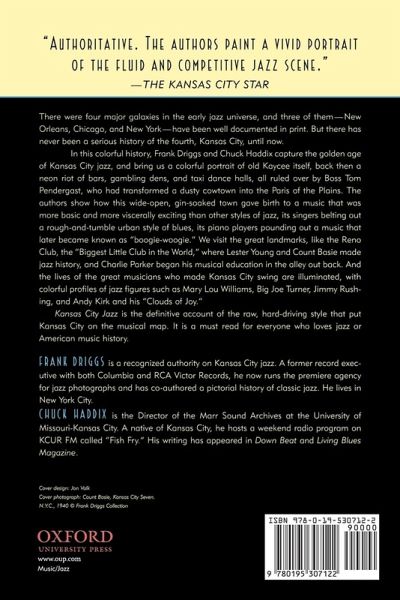 There were four major galaxies in the early jazz universe, and three of them--New Orleans, Chicago, and New York--have been well documented in print. But there has never been a serious history of the fourth, Kansas City, until now. In this colorful history, Frank Driggs and Chuck Haddix capture the golden age of Kansas City jazz, and bring us a colorful portrait of old Kaycee itself, back then a neon riot of bars, bambling dens, and taxi dance halls, all ruled over by Boss Tom Pendergast, who had transformed a dusty cowtown into the Paris of the Plains. The authors show how this wide-open, gin-soaked town gave birth to a music that was more basic and more viscerally exciting than other styles of jazz, its singers belting out a rough-and-tumble urban style of blues, its piano players pounding out a style later known as "boogie-woogie." We visit the great landmarks, like the Reno Club, the "Biggest Little Club in the World," where Lester Young and Count Basie made jazz history, and Charlie Parker began his musical education in the alley out back. The lives of the great musicians who made Kansas City swing are illuminated, with colorful profiles of jazz figures such as Mary Lou Williams, Big Joe Turner, Jimmy Rushing, and Andy Kirk and his "Clouds of Joy." Kansas City Jazz is the definitive account of the raw, hard-driving style that put Kansas City on the musical map. It is a must read for everyone who loves jazz or American music history.
