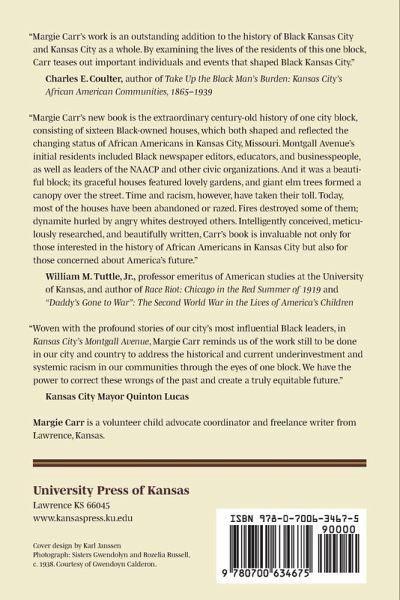 A few blocks southeast of the famed intersection of 18th and Vine in Kansas City, Missouri, just a stone's throw from Charlie Parker's old stomping grounds and the current home of the vaunted American Jazz Museum and Negro Leagues Baseball Museum, sits Montgall Avenue. This single block was home to some of the most important and influential leaders the city has ever known. Margie Carr's Kansas City's Montgall Avenue: Black Leaders and the Street They Called Home is the extraordinary, century-old history of one city block whose residents shaped the changing status of Black people in Kansas City and built the social and economic institutions that supported the city's Black community during the first half of the twentieth century. The community included, among others, Chester Franklin, founder of the city's Black newspaper, The Call; Lucile Bluford, a University of Kansas alumna who worked at The Call for 69 years; and Dr. John Edward Perry, founder of Wheatley-Provident Hospital, Kansas City's first hospital for Black people. The principal and four teachers from Lincoln High School, Kanas City's only high school for African American students, also lived on the block. While introducing the reader to the remarkable individuals living on Montgall Avenue, Carr also uses this neighborhood as a microcosm of the changing nature of discrimination in twentieth-century America. The city's white leadership had little interest in supporting the Black community and instead used its resources to separate and isolate them. The state of Missouri enforced segregation statues until the 1960s and the federal government created housing policies that erased any assets Black homeowners accumulated, robbing them of their ability to transfer that wealth to the next generation. Today, the 2400 block of Montgall Avenue is situated in one of the poorest neighborhoods in Kansas City. The attitudes and policies that contributed to the neighborhood's changing environment paint a more complete--and disturbing--picture of the role that race in continues to play in America's story.