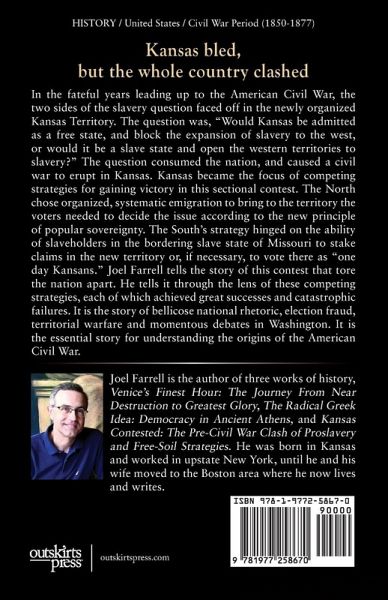 In the fateful years leading up to the American Civil War, the two sides of the slavery question faced off in the newly organized Kansas Territory. The question was, "Would Kansas be admitted as a free state, and block the expansion of slavery to the west, or would it be a slave state and open the western territories to slavery?" The question consumed the nation, and caused a civil war to erupt in Kansas. Kansas became the focus of competing strategies for gaining victory in this sectional contest. The North chose organized, systematic emigration to bring to the territory the voters needed to decide the issue according to the new principle of popular sovereignty. The South's strategy hinged on the ability of slaveholders in the bordering slave state of Missouri to stake claims in the new territory or, if necessary, to vote there as "one day Kansans." Joel Farrell tells the story of this contest that tore the nation apart. He tells it through the lens of these competing strategies, each of which achieved great successes and catastrophic failures. It is the story of bellicose national rhetoric, election fraud, territorial warfare and momentous debates in Washington. It is the essential story for understanding the origins of the American Civil War.