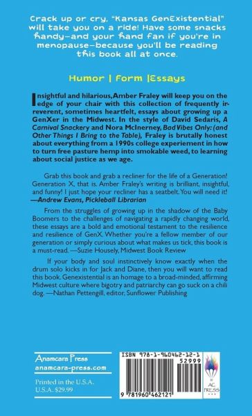 Crack up or cry, Kansas GenExistential will take you on a ride! Have some snacks handy-and your hand fan if you're in menopause-because you'll be reading this book all at once. Insightful and hilarious, Amber Fraley will keep you on the edge of your chair with this collection of frequently irreverent, sometimes heartfelt, essays about growing up a GenXer in the Midwest. In the style of David Sedaris, Carnival Snackery and Nora McInerney, Bad Vibes Only: (and Other Things I Bring to the Table), Fraley is brutally honest about everything from a 1990s college experiement in how to turn free pasture hemp into smokable weed with your friends, to learning about social justice as we age. With her trademark biting wit, Fraley describes the foibles and follies of growing up a kid in the turbulent and strange decade of the 1980s, odd characters she encountered in the 1990s, and how GenXers are now handling midlife differently than their parents. She also talks frankly about her late entry into the reproductive justice movement and what menopause is really like with equal parts humor and compassion. From the long, strange trip of the Reagan years to the Trump years, and the particular frustrations of being from the Midwest, Fraley's view on life is refreshing. These biting essays delve into identity, resilience, and activism. From navigating childhood challenges to fighting for bodily autonomy, Fraley's heartfelt narratives and timely insights invite readers to embrace diversity, challenge stereotypes, and join the ongoing battle for justice-while laughing out-loud.