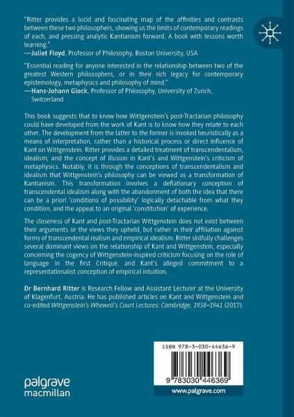 This book suggests that to know how Wittgenstein's post-Tractarian philosophy could have developed from the work of Kant is to know how they relate to each other. The development from the latter to the former is invoked heuristically as a means of interpretation, rather than a historical process or direct influence of Kant on Wittgenstein. Ritter provides a detailed treatment of transcendentalism, idealism, and the concept of illusion in Kant's and Wittgenstein's criticism of metaphysics. Notably, it is through the conceptions of transcendentalism and idealism that Wittgenstein's philosophy can be viewed as a transformation of Kantianism. This transformation involves a deflationary conception of transcendental idealism along with the abandonment of both the idea that there can be a priori 'conditions of possibility' logically detachable from what they condition, and the appeal to an original 'constitution' of experience.