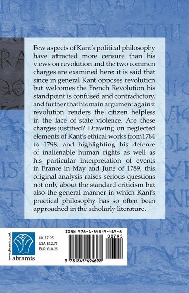 Few aspects of Kant's political philosophy have attracted more censure than his views on revolution and the two common charges are examined here: it is said that since in general Kant opposes revolution but welcomes the French Revolution his standpoint is confused and contradictory, and further that his main argument against revolution renders the citizen helpless in the face of state violence. Are these charges justified? Drawing on neglected elements of Kant's ethical works from1784 to 1798, and highlighting his defence of inalienable human rights as well as his particular interpretation of events in France in May and June of 1789, this original analysis raises serious questions not only about the standard criticism but also the general manner in which Kant's practical philosophy has so often been approached in the scholarly literature.