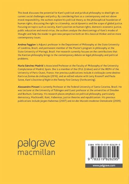 Andrea Faggion is an adjunct professor in the Department of Philosophy at the State University of Londrina, Brazil, and permanent member of the master's program in philosophy at the State University of Maringa. Her research currently focuses on the contributions that the Kantian philosophy brings to the contemporary debate on the legal philosophy and political problems. Nuria Sánchez Madrid is Associated Professor at the Faculty of Philosophy of the University Complutense of Madrid, Spain. She is a member of the CFUL (Lisbon) and of the IREPH of the University of Paris-Ouest, France. Her previous publications include A civilizaçâo como destino: Kant e as formas da civilizaçâo, (2016) and an edited volume with Larry Krasnoff and Paula Satne, Kant's Doctrine of Right in the Twenty First Century, forthcoming. Alessandro Pinzani is currently a professor at the UFSC, Brazil. He was a lecturer at the University of Tübingen and a guest professor at the universities of Dresden and Bochum, Germany. His research places emphasis on political philosophy, particularly democracy, Machiavelli, Kant, Habermas, justice theories and republicanism. His previous publications include Jürgen Habermas (2007) and An den Wurzeln moderner Demokratie (2009).