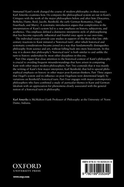 Immanuel Kant's work changed the course of modern philosophy; in these essays Karl Ameriks examines how. He compares the philosophical system set out in Kant's Critiques with the work of the major philosophers before and after him (Descartes, Berkeley, Hume, Reid, Jacobi, Reinhold, the early German Romantics, Hegel, Feuerbach, and Marx). A systematic introduction argues that complexities in the interpretation of Kant's system led to a new emphasis on history,
