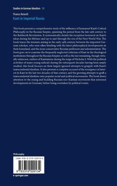 This book presents a comprehensive study of the influence of Immanuel Kant's Critical Philosophy in the Russian Empire, spanning the period from the late 19th century to the Bolshevik Revolution. It systematically details the reception bestowed on Kant's ideas during his lifetime and up to and through the era of the First World War. The book traces the tensions arising in the early 19th century between the imported German scholars, who were often bristling with the latest philosophical developments in their homeland, and the more conservative Russian professors and administrators. The book goes on to examine the frequently neglected criticism of Kant in the theological institutions throughout the Russian Empire as well as the last remaining, though virtually unknown, embers of Kantianism during the reign of Nicholas I. With the political activities of many young radicals during the subsequent decades having been amply studied, this book focuses on their largely ignored attempts to grapple with Kant's transcendental idealism. It also presents a complete account of the resurgence of interest in Kant in the last two decades of that century, and the growing attempts to graft a transcendental idealism onto popular social and political movements. The book draws attention to the young and budding Russian neo-Kantian movement that mirrored developments in Germany before being overtaken by political events.