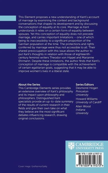 This Element proposes a new understanding of Kant's account of marriage by examining the context and background conversations that shaped its development and by discussing the conception of equality at its core. Marriage as Kant understands it relies on a certain form of equality between spouses. Yet this conception of equality does not precede marriage, and carries important limitations - one of which being its inaccessibility to a significant proportion of the German population at the time. The protections and rights conferred by marriage were thus not accessible to all. Their shared preoccupation with this issue allows the author to put Kant's thoughts in relation with those of eighteenth-century feminist writers Theodor von Hippel and Marianne Ehrmann. Despite these limitations, the author finds that Kant's conception of marriage is compatible with the achievement of certain egalitarian goals, suggesting that it may be able to improve women's lives in a liberal state.