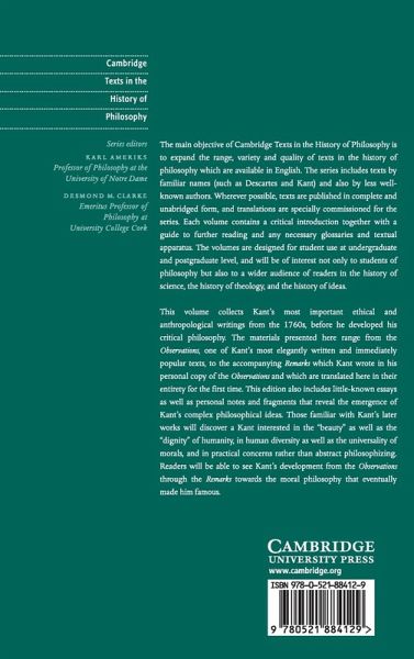 This volume collects Kant's most important ethical and anthropological writings from the 1760s, before he developed his critical philosophy. The materials presented here range from the Observations, one of Kant's most elegantly written and immediately popular texts, to the accompanying Remarks which Kant wrote in his personal copy of the Observations and which are translated here in their entirety for the first time. This edition also includes little-known essays as well as personal notes and fragments that reveal the emergence of Kant's complex philosophical ideas. Those familiar with Kant's later works will discover a Kant interested in the 'beauty' as well as the 'dignity' of humanity, in human diversity as well as the universality of morals, and in practical concerns rather than abstract philosophizing. Readers will be able to see Kant's development from the Observations through the Remarks towards the moral philosophy that eventually made him famous.
