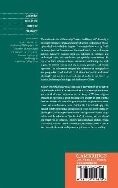 Religion within the Boundaries of Mere Reason is a key element of the system of philosophy which Kant introduced with his Critique of Pure Reason, and a work of major importance in the history of Western religious thought. It represents a great philosopher's attempt to spell out the form and content of a type of religion that would be grounded in moral reason and would meet the needs of ethical life. It includes sharply critical and boldly constructive discussions on topics not often treated by philosophers, including such traditional theological concepts as original sin and the salvation or 'justification' of a sinner, and the idea of the proper role of a church. This new edition includes slightly revised translations, a revised introduction with expanded discussion of certain key themes in the work, and up-to-date guidance on further reading.