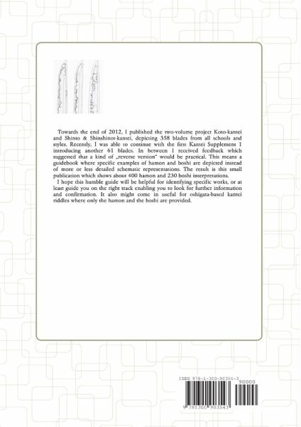 Towards the end of 2012, I published the two-volume project Koto-kantei and Shinto & Shinshinto-kantei, depicting 358 blades from all schools and styles. Recently, I was able to continue with the first Kantei Supplement 1 introducing another 61 blades. In between I received feedback which suggested that a kind of "reverse version" would be practical. This means a guidebook where specific examples of hamon and b¿shi are depicted instead of more or less detailed schematic representations. The result is this small publication which shows about 400 hamon and 230 boshi interpretations. I hope this humble guide will be helpful for identifying specific works, or at least guide you on the right track enabling you to look for further information and confirmation. It also might come in useful for oshigata-based kantei riddles where only the hamon and the boshi are provided.