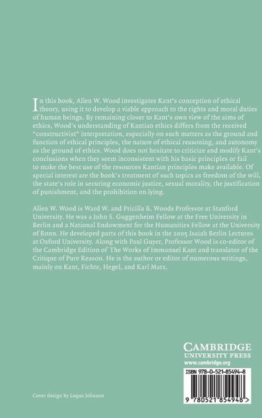 Allen Wood investigates Kant's conception of ethical theory, using it to develop a viable approach to the rights and moral duties of human beings. By remaining closer to Kant's own view of the aims of ethics, Wood's understanding of Kantian ethics differs from the received 'constructivist' interpretation, especially on such matters as the ground and function of ethical principles, the nature of ethical reasoning and autonomy as the ground of ethics. Wood does not hesitate to criticize and modify Kant's conclusions when they seem inconsistent with his basic principles or fail to make the best use of the resources Kantian principles make available. Of special interest are the book's treatment of such topics as freedom of the will, the state's role in securing economic justice, sexual morality, the justification of punishment, and the prohibition on lying.