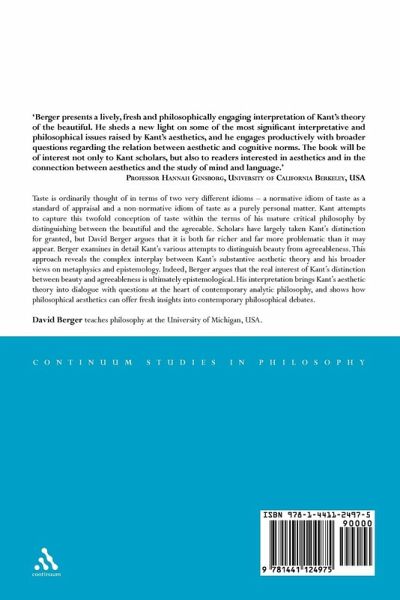 Taste is ordinarily thought of in terms of two very different idioms - a normative idiom of taste as a standard of appraisal and a non-normative idiom of taste as a purely personal matter. Kant attempts to capture this twofold conception of taste within the terms of his mature critical philosophy by distinguishing between the beautiful and the agreeable. Scholars have largely taken Kant's distinction for granted, but David Berger argues that it is both far richer and far more problematic than it may appear. Berger examines in detail Kant's various attempts to distinguish beauty from agreeableness. This approach reveals the complex interplay between Kant's substantive aesthetic theory and his broader views on metaphysics and epistemology. Indeed, Berger argues that the real interest of Kant's distinction between beauty and agreeableness is ultimately epistemological. His interpretation brings Kant's aesthetic theory into dialogue with questions at the heart of contemporary analytic philosophy and shows how philosophical aesthetics can offer fresh insights into contemporary philosophical debates.