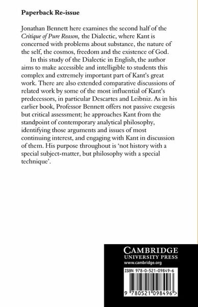 Jonathan Bennett here examines the second half of the Critique of Pure Reason, the Dialectic, where Kant is concerned with problems about substance, the nature of the self, the cosmos, freedom and the existence of God. In this study of the Dialectic in English, the author aims to make accessible and intelligible to students this complex and extremely important part of Kant's great work. There are also extended comparative discussions of related work by some of the most influential of Kant's predecessors, in particular Descartes and Leibniz. As in his earlier book, Professor Bennett offers not passive exegesis but critical assessment; he approaches Kant from the standpoint of contemporary analytical philosophy, identifying those arguments and issues of most continuing interest, and engaging with Kant in discussion of them. His purpose throughout is 'not history with a special subject-matter, but philosophy with a special technique'.