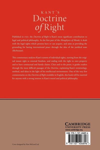 Published in 1797, the Doctrine of Right is Kant's most significant contribution to legal and political philosophy. As the first part of the Metaphysics of Morals, it deals with the legal rights which persons have or can acquire, and aims at providing the grounding for lasting international peace through the idea of the juridical state (Rechtsstaat). This commentary analyzes Kant's system of individual rights, starting from the original innate right to external freedom, and ending with the right to own property and to have contractual and family claims. Clear and to the point, it guides readers through the most difficult passages of the Doctrine, explaining Kant's terminology, method and ideas in the light of his intellectual environment. One of the very few commentaries on the Doctrine of Right available in English, this book will be essential for anyone with a strong interest in Kant's moral and political philosophy.