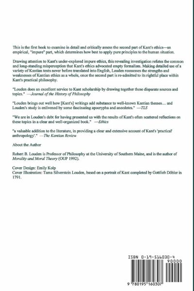 This is the first book-length study in any language to examine in detail and critically assess the second part of Kant's ethics--an empirical, impure part, which determines how best to apply pure principles to the human situation. Drawing attention to Kant's under-explored impure ethics, this revealing investigation refutes the common and long-standing misperception that Kants ethics advocates empty formalism. Making detailed use of a variety of Kantian texts never before translated into English, author Robert B. Louden reassesses the strengths and weaknesses of Kantian ethics as a whole, once the second part is re-admitted to its rightful place within Kant's practical philosophy.