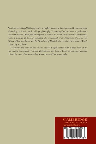 This volume brings to English readers the finest postwar German-language scholarship on Kant's moral and legal philosophy. Examining Kant's relation to predecessors such as Hutcheson, Wolff, and Baumgarten, it clarifies the central issues in each of Kant's major works in practical philosophy, including The Groundwork of the Metaphysics of Morals, The Critique of Practical Reason, and The Metaphysics of Morals. It also examines the relation of Kant's philosophy to politics. Collectively, the essays in this volume provide English readers with a direct view of how leading German philosophers are now regarding Kant's revolutionary practical philosophy, one of the outstanding achievements of German thought.