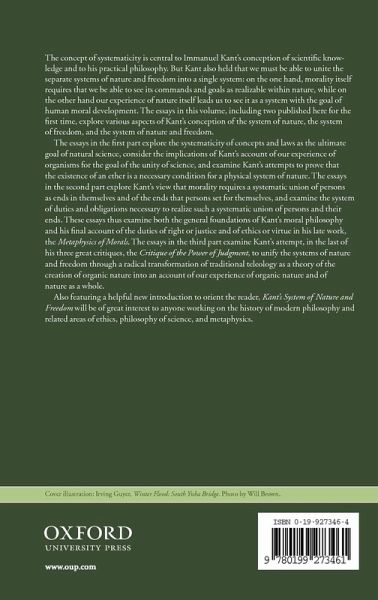* Introduction * Part I: The System of Nature * 1: Reason and Reflective Judgement: Kant on the Significance of Systematicity * 2: Kant's Conception of Empirical Law * 3: Kant on the Systematicity of Nature: Two Puzzles * 4: Kant's Ether Deduction and the Possibility of Experience * 5: Organisms and the Unity of Science * Part II: The System of Freedom * 6: Kant on the Theory and Practice of Autonomy * 7: The Form and Matter of the Categorical Imperative * 8: Ends of Reason and Ends of Nature: The Place of Teleology in Kant's Ethics * 9: Kant's Deductions of the Principles of Right * 10: Kant's System of Duties * Part III: The System of Nature and Freedom * 11: The Unity of Nature and Freedom: Kant's Conception of the System of Philosophy * 12: From Nature to Morality: Kant's New Argument in the 'Critique of Teleological Judgement' * 13: Purpose in Nature: What is Living and What is Dead in Kant's Teleology