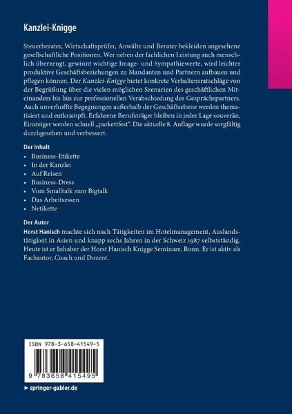 Steuerberater, Wirtschaftsprüfer, Anwälte und Berater bekleiden angesehene gesellschaftliche Positionen. Wer neben der fachlichen Leistung auch menschlich überzeugt, gewinnt wichtige Image- und Sympathiewerte, wird leichter produktive Geschäftsbeziehungen zu Mandanten und Partnern aufbauen und pflegen können. Die aktuelle 8. Auflage wurde sorgfältig durchgesehen und verbessert.