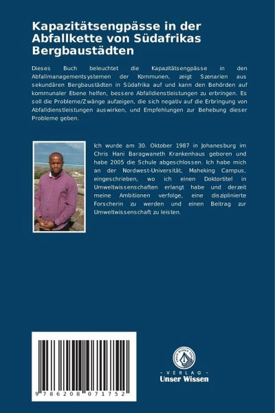 Dieses Buch beleuchtet die Kapazitätsengpässe in den Abfallmanagementsystemen der Kommunen, zeigt Szenarien aus sekundären Bergbaustädten in Südafrika auf und kann den Behörden auf kommunaler Ebene helfen, bessere Abfalldienstleistungen zu erbringen. Es soll die Probleme/Zwänge aufzeigen, die sich negativ auf die Erbringung von Abfalldienstleistungen auswirken, und Empfehlungen zur Behebung dieser Probleme geben.