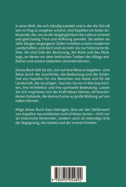 In einer Welt, die sich ständig wandelt und in der die Zeit oft wie im Flug zu vergehen scheint, sind Kapellen ein fester Ankerpunkt, der uns an die Vergänglichkeit des Lebens erinnert und gleichzeitig Trost und Hoffnung spendet. Sie stehen als stille Zeugen vergangener Zeiten inmitten unserer modernen Landschaften, und doch sind sie mehr als nur historische Relikte. Sie sind Orte der Besinnung, der Ruhe und des Rückzugs, an denen wir dem hektischen Treiben des Alltags entfliehen und unsere Gedanken sammeln können.Dieses Buch lädt Sie ein, sich auf eine Reise zu begeben - eine Reise durch die Geschichte, die Bedeutung und die Schönheit von Kapellen für uns Menschen von heute und für die Landschaft, die sie prägen. Tauchen Sie ein in ihre Geschichten, ihre Architektur und ihre spirituelle Bedeutung. Lassen Sie sich inspirieren von der Kraft dieser kleinen, oft bescheidenen Gebäude, die dennoch eine so große Wirkung auf uns haben können.Möge dieses Buch dazu beitragen, dass wir denStellenwert von Kapellen neu entdecken und schätzen lernen - nicht nur als historische Denkmäler, sondern auch als lebendige Orte der Begegnung, des Gebets und der inneren Einkehr.