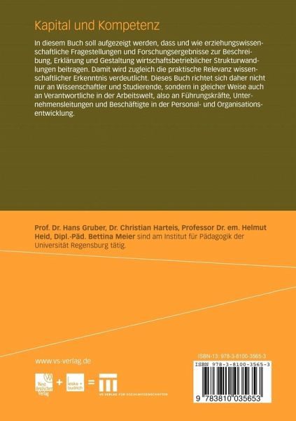 Vorwort.- I Kapital und Kompetenz - ist das Eine ohne das Andere zu haben?.- Kapital und Kompetenz.- Betriebliche Personal- und Organisationsentwicklung zwischen ökonomischen und pädagogischen Überlegungen.- Kapital und Kompetenz - ist das Eine ohne das Andere zu haben?.- II Berufliches Lernen im Arbeitsalltag.- Fehlerkultur und epistemische Überzeugungen als Einflussfaktoren individuellen Kompetenzerwerbs im Arbeitsalltag.- Förderung und Anwendung individueller Kompetenz im Arbeitsalltag.- Sechs Wege, die Kluft zwischen Lernen und Arbeiten zu überwinden.- Cognitive Apprenticeship und Veränderungen in der Arbeitswelt.- Lebenslanges Lernen vor dem Hintergrund der Alterung des Erwerbspersonenpotenzials am Beispiel der IT-Qualifikationen.- Bildungscontrolling in der betrieblichen Personalentwicklung - Optimierung von Qualifizierungsmaßnahmen.- III Betriebe als Handlungsfelder von Individuen.- Der Mitarbeiter - Kostenfaktor oder Erfolgsfaktor?.- Kompetenzentwicklung bei Unternehmensberatern.- Auf dem Weg zur persönlichen Berufszufriedenheit.- Organisationales Lernen und Expertennetzwerke.- Die Bedeutung von Virtuellen Gemeinschaften und Communities of Practice für Unternehmen.- IV Der Markt als Determinante betrieblichen Handelns.- High Performance Arbeitssysteme und ihre Auswirkungen auf die Organisationsleistung und die Beschäftigten.- New und Old Economy: Zwei Welten? Neue Formen der Arbeit und ihrer Organisation.- Die Gruppe unter dem Einfluss neuer Technologien.- V Kapital und Kompetenz - Meta-Analyse.- Kompetenzentwicklung in der industrialisierten Dienstleistungsgesellschaft: Flexibilitätszwänge oder Gestaltungschancen von Arbeit?.- Über die individuellen und sozialen Effekte der Flexibilisierung.- Autorenverzeichnis.