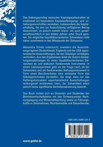 Alexandra Scholz untersucht, inwiefern die Ausschüttungsregimes Deutschlands, Englands und der USA opportunistische Ausschüttungen, die den Gläubiger schädigen, verhindern. Aus den Ergebnissen leitet die Autorin Gestaltungsempfehlungen für einen liquiditätsorientierten Solvenztest ab und diskutiert flankierende Instrumente. In einem Laborexperiment geht sie der Frage nach, ob der Solvenztest und ein flankierendes Haftungsinstrument in Form eines Berufsverbotes eine wirksame Form des Gläubigerschutzes darstellen. Sie zeigt, dass nur das Haftungsinstrument opportunistische Ausschüttungen wirkungsvoll eindämmen kann, der Solvenztest allein jedoch keine signifikante Verhaltensänderung bewirkt.
