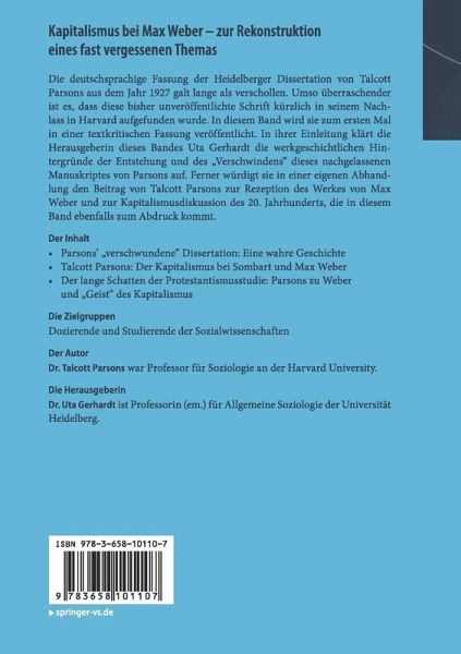 Die deutschsprachige Fassung der Heidelberger Dissertation von Talcott Parsons aus dem Jahr 1927 galt lange als verschollen. Umso überraschender ist es, dass diese bisher unveröffentlichte Schrift kürzlich in seinem Nachlass in Harvard aufgefunden wurde. In diesem Band wird sie zum ersten Mal in einer textkritischen Fassung veröffentlicht. In ihrer Einleitung klärt die Herausgeberin dieses Bandes Uta Gerhardt die werkgeschichtlichen Hintergründe der Entstehung und des "Verschwindens" dieses nachgelassenen Manuskriptes von Parsons auf. Ferner würdigt sie in einer eigenen Abhandlung den Beitrag von Talcott Parsons zur Rezeption des Werkes von Max Weber und zur Kapitalismusdiskussion des 20. Jahrhunderts, die in diesem Band ebenfalls zum Abdruck kommt.