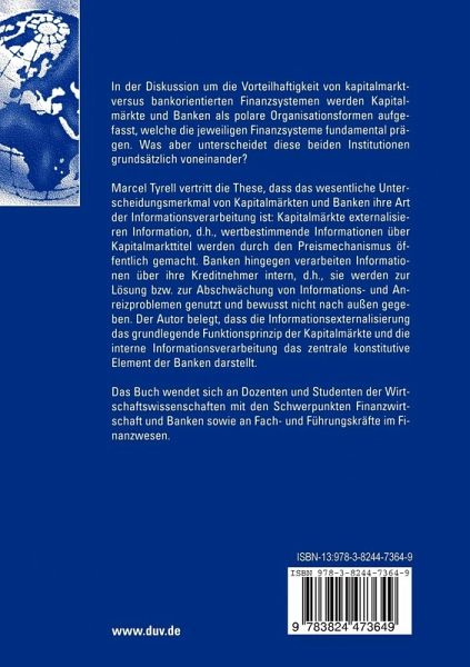 Marcel Tyrell vertritt die These, dass das wesentliche Unterscheidungsmerkmal von Kapitalmärkten und Banken ihre Art der Informationsverarbeitung ist: Kapitalmärkte externalisieren Information, d.h., wertbestimmende Informationen über Kapitalmarkttitel werden durch den Preismechanismus öffentlich gemacht. Banken hingegen verarbeiten Informationen über ihre Kreditnehmer intern, d.h., sie werden zur Lösung bzw. zur Abschwächung von Informations- und Anreizproblemen genutzt und bewusst nicht nach außen gegeben. Der Autor belegt, dass die Informationsexternalisierung das grundlegende Funktionsprinzip der Kapitalmärkte und die interne Informationsverarbeitung das zentrale konstitutive Element der Banken darstellt.