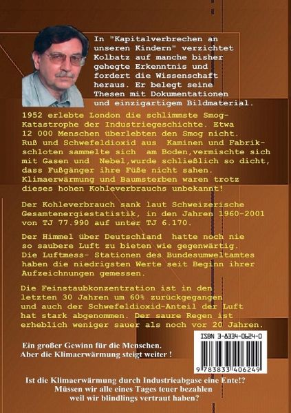 In "Kapitalverbrechen an unseren Kindern" verzichtet Kolbatz auf manche bisher gehegte Erkenntnis und fordert die Wissenschaft heraus. Er belegt seine Thesen mit Dokumentationen und einzigartigen Bildmaterial. Der Himmel über Deutschland hatte noch nie so saubere Luft zu bieten wie gegenwärtig. Die Luftmess- Stationen des Bundesumweltamtes haben die niedrigsten Werte seit Beginn ihrer Aufzeichnungen gemessen. Die Feinstaubkonzentration ist in den letzten 30 Jahren um 60% zurückgegangen und auch der Schwefeldioxid-Anteil der Luft hat stark abgenommen. Der saure Regen ist erheblich weniger sauer als noch vor 20 Jahren. Ein großer Gewinn für die Menschen. Aber die Klimaerwärmung steigt weiter ! Ist die Klimaerwärmung durch Industrieabgase eine Ente !? Müssen wir alle eines Tages teuer bezahlen weil wir blindlings vertraut haben? Beitrag für den ¿ZDF - muna 2003 ¿ Naturschutzpreis¿ die die Wissenschaft zum umdenken zwingt