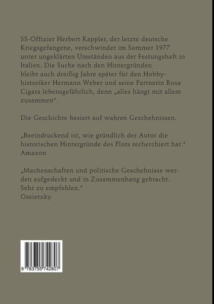 SS-Offizier Herbert Kappler, der letzte deutsche Kriegsgefangene, verschwindet im Sommer 1977 unter ungeklärten Umständen aus der Festungshaft in Italien. Die Suche nach den Hintergründen bleibt auch dreißig Jahre später für den Hobbyhistoriker Hermann Weber und seine Partnerin Rosa Cigara lebensgefährlich.Alles hängt mit allem zusammen.Die Geschichte basiert auf wahren Geschehnissen.