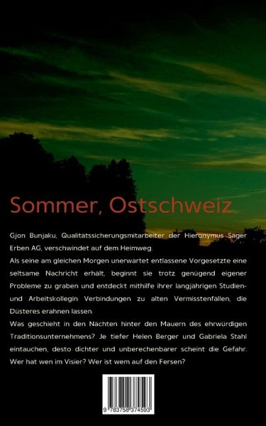 Gjon Bunjaku, Qualitätssicherungsmitarbeiter der Hieronymus Säger Erben AG, verschwindet auf dem Heimweg.Als seine am gleichen Morgen unerwartet entlassene Vorgesetzte eine seltsame Nachricht erhält, beginnt sie trotz genügend eigener Probleme zu graben und entdeckt mithilfe ihrer langjährigen Studien- und Arbeitskollegin Verbindungen zu alten Vermisstenfällen, die Düsteres erahnen lassen.Was geschieht in den Nächten hinter den Mauern des ehrwürdigen Traditionsunternehmens? Je tiefer Helen Berger und Gabriela Stahl eintauchen, desto dichter und unberechenbarer scheint die Gefahr. Wer hat wen im Visier? Wer ist wem auf den Fersen?Ein Thriller für Erwachsene