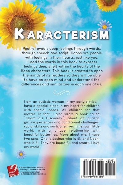 Poetry reveals deep feelings through words, through speech and script. Hobos are people with feelings in their hearts, just like you. I used the words in this book to express feelings deeply felt within the hearts of the Hobo characters. This book is created to open the minds of its readers so they will be able to have an open mind and understand the differences and similarities in each one of us.