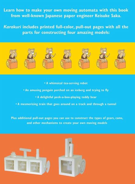 Originally published in Japan, Karakuri is an introduction to the simple mechanisms, such as gears, cranks, cams, and levers, used to bring to life these amazing moving paper models or automata. Included are pull-out pages for you to use to construct your own moving models of the different types of gears. These models serve as the basis for designing your own karakuri or may just be admired on their own. Detailed explanations, accompanied by diagrams, explain the physics behind how karakuri move and operate, so you really learn about the properties of the different types of gears and cams. And to inspire you, also included are four fun, full-color karakuri models designed by the author, a well-known paper engineer. Printed on pull-out pages and easily assembled, the projects include a whimsical tea-serving robot, an amusing penguin perched on an iceberg and trying to fly, a delightful peek-a-boo-playing teddy bear, and a mesmerizing train that goes around on a track and through a tunnel! With complete directions, fourteen full-size models, and the science behind the craft revealed, Keisuke Saka's book is a unique introduction to an ancient art and a perfect gift for creative and imaginative minds.