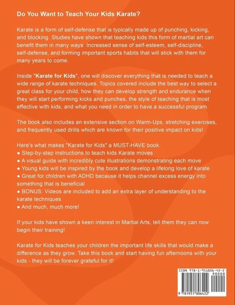 Do You Want to Teach Your Kids Karate? Karate is a form of self-defense that is typically made up of punching, kicking, and blocking. Studies have shown that teaching kids this form of martial art can benefit them in many ways: Increased sense of self-esteem, self-discipline, self-defense, and forming important sports habits that will stick with them for many years to come. Inside "Karate for Kids", one will discover everything that is needed to teach a wide range of karate techniques. Topics covered include the best way to select a great class for your child, how they can develop strength and endurance when they will start performing kicks and punches, the style of teaching that is most effective with kids, and what you need in order to have a successful program. The book also includes an extensive section on Warm-Ups, stretching exercises, and frequently used drills which are known for their positive impact on kids! Here's what makes "Karate for Kids" a MUST-HAVE book: ¿ Step-by-step instructions to teach kids Karate moves ¿ A visual guide with incredibly cute illustrations demonstrating each move ¿ Young kids will be inspired by the book and develop a lifelong love of karate ¿ Great for children with ADHD because it helps channel excess energy into something that is beneficial ¿ BONUS: Videos are included to add an extra layer of understanding to the karate techniques ¿ And much, much more! If your kids have shown a keen interest in Martial Arts, tell them they can now begin their training! Karate for Kids teaches children the important life skills that would make a difference as they grow. Take this book and start having fun afternoons with your kids - they will be forever grateful for it! Scroll up, click on "Buy Now" and get started!