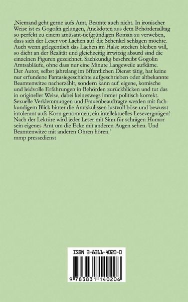 Niemand geht gerne aufs Amt, Beamte auch nicht. In ironischer Weise verwebt Gogolin Anekdoten aus dem Behördenalltag perfekt zu einem amüsant-tiefgründigen Roman. Auch wenn gelegentlich das Lachen im Halse stecken bleiben will, so dicht an der Realität und gleichzeitig irrwitzig absurd sind die einzelnen Figuren gezeichnet. Sachkundig werden Amtsabläufe beschrieben, ohne dass nur eine Minute Langeweile aufkäme. Der Autor, selbst jahrelang im öffentlichen Dienst tätig, hat keine nur erfundene Fantasiegeschichte aufgeschrieben oder altbekannte Beamtenwitze nacherzählt, sondern kann auf eigene, komische und leidvolle Erfahrungen in Behörden zurückblicken und tut das in origineller Weise, dabei keineswegs immer politisch korrekt. Sexuelle Verklemmungen und Frauenbeauftragte werden in Gogolins fachkundigem Blick hinter die Amtskulissen lustvoll böse und bewusst intolerant aufs Korn genommen, ein intellektuelles Lesevergnügen! Nach der Lektüre wird jeder Leser mit Sinn für schrägen Humor sein Amt um die Ecke mit anderen Augen sehen. Und Beamtenwitze mit anderen Ohren hören.