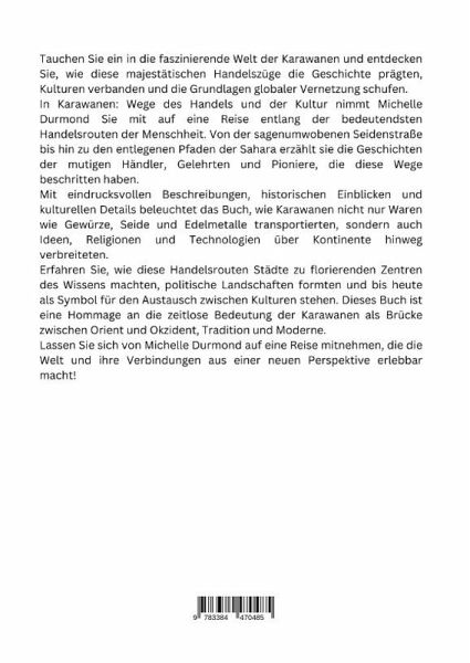 Tauchen Sie ein in die faszinierende Welt der Karawanen und entdecken Sie, wie diese majestätischen Handelszüge die Geschichte prägten, Kulturen verbanden und die Grundlagen globaler Vernetzung schufen.In Karawanen: Wege des Handels und der Kultur nimmt Michelle Durmond Sie mit auf eine Reise entlang der bedeutendsten Handelsrouten der Menschheit. Von der sagen-umwobenen Seidenstraße bis hin zu den entlegenen Pfaden der Sahara erzählt sie die Geschichten der mutigen Händler, Gelehrten und Pioniere, die diese Wege beschritten haben.Mit eindrucksvollen Beschreibungen, historischen Einblicken und kulturellen Details beleuchtet das Buch, wie Karawanen nicht nur Waren wie Gewürze, Seide und Edelmetalle transportierten, sondern auch Ideen, Religionen und Technologien über Kontinente hinweg verbreiteten.Erfahren Sie, wie diese Handelsrouten Städte zu florierenden Zentren des Wissens machten, politische Landschaften formten und bis heute als Symbol für den Austausch zwischen Kulturen stehen. Dieses Buch ist eine Hommage an die zeitlose Bedeutung der Karawanen als Brücke zwischen Orient und Okzident, Tradition und Moderne.Lassen Sie sich von Michelle Durmond auf eine Reise mitnehmen, die die Welt und ihre Verbindungen aus einer neuen Perspektive erlebbar macht!