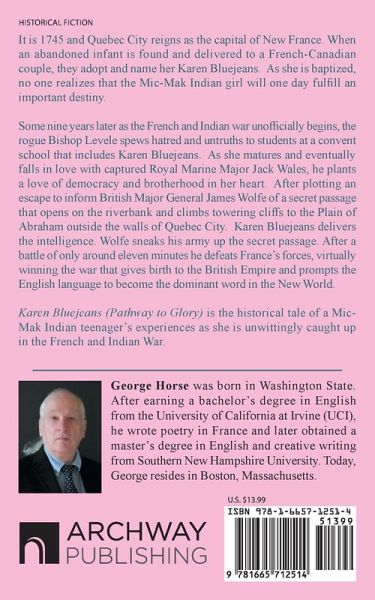 It is 1745 and Quebec City reigns as the capital of New France. When an abandoned infant is found and delivered to a French-Canadian couple, they adopt and name her Karen Bluejeans. As she is baptized, no one realizes that the Mic-Mak Indian girl will one day fulfill an important destiny. Some nine years later as the French and Indian war unofficially begins, the rogue Bishop Levele spews hatred and untruths to students at a convent school that includes Karen Bluejeans. As she matures and eventually falls in love with captured Royal Marine Major Jack Wales, he plants a love of democracy and brotherhood in her heart. After plotting an escape to inform British Major General James Wolfe of a secret passage that opens on the riverbank and climbs towering cliffs to the Plain of Abraham outside the walls of Quebec City. Karen Bluejeans delivers the intelligence. Wolfe sneaks his army up the secret passage. After a battle of only around eleven minutes he defeats France's forces, virtually winning the war that gives birth to the British Empire and prompts the English language to become the dominant word in the New World. Karen Bluejeans (Pathway to Glory) is the historical tale of a Mic-Mak Indian teenager's experiences as she is unwittingly caught up in the French and Indian War.
