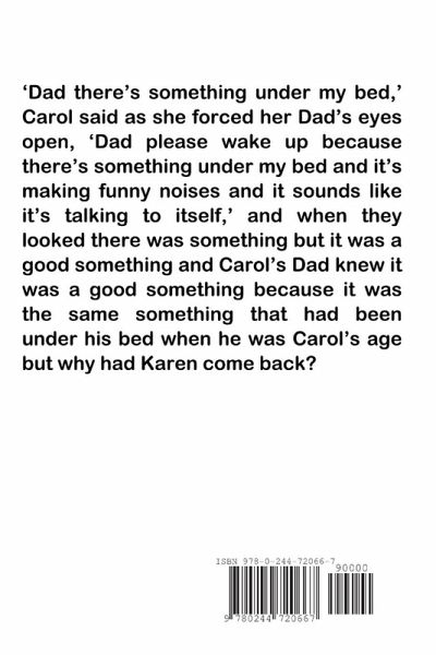 'Dad there's something under my bed,' Carol said as she forced her Dad's eyes open, 'Dad please wake up because there's something under my bed and it's making funny noises and it sounds like it's talking to itself,' and when they looked there was something but it was a good something and Carol's Dad knew it was a good something because it was the same something that had been under his bed when he was Carol's age but why had Karen come back?