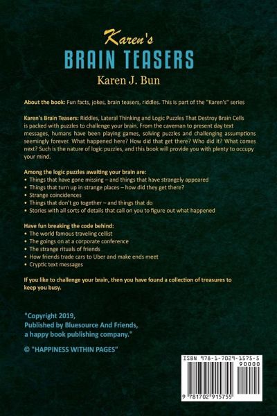 Can You Solve This? I am in every city in the world. I am in every hotel in the world. I am in every hotel room in the world. Just in case. Though mostly ignored, I remain, just in case. What am I? Karen's Brain Teasers: Riddles, Lateral Thinking and Logic Puzzles That Destroy Brain Cells is packed with puzzles, fun facts, word quizzes to challenge your brain. From the cavemen to present day text messages, humans have been playing games, solving puzzles and challenging assumptions. What happened here? How did that get there? Who did it? What comes next? Such is the nature of logic puzzles, and this book will provide you with plenty to occupy your mind. Among the logic puzzles awaiting your brain are: Things that have gone missing - and things that have strangely appeared Things that turn up in strange places - how did they get there? Strange coincidences Things that don't go together - and things that do Stories with all sorts of details that call on you to figure out what happened Have fun breaking the code behind: The world-famous traveling cellist The goings on at a corporate conference The strange rituals of friends How friends trade cars to Uber and make ends meet Cryptic text messages If you like to challenge your brain, then click on the "BUY NOW" button now.