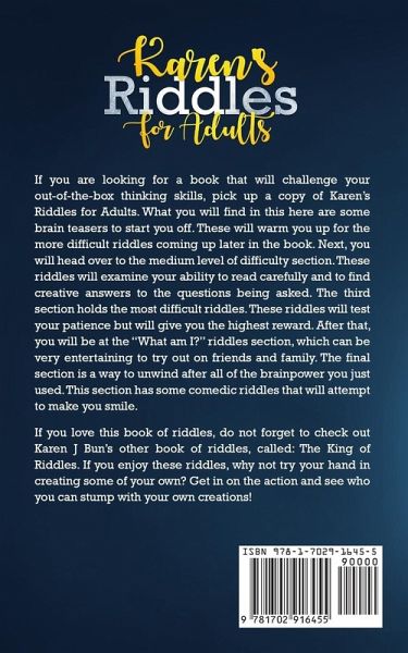 Can you solve this? One day in the year 1743, a king asked his most trusted advisers, "What should I do if a person tries to touch my toupee?" One of the advisers says, "His hand should be chopped off." Another adviser says, "He should be beheaded in front of the commoners." The third and wisest adviser to the king said, "He should be given a bar of chocolate." The king and the other two advisers were baffled by this response. Why did the third adviser suggest this? If you are looking for a book that will challenge your out-of-the-box thinking skills, pick up a copy of Karen's Riddles for Adults. What you will find in this here are some brain teasers to start you off. These will warm you up for the more difficult riddles coming up later in the book. Next, you will head over to the medium level of difficulty section. These riddles will examine your ability to read carefully and to find creative answers to the questions being asked. The third section holds the most difficult riddles. These riddles will test your patience but will give you the highest reward. After that, you will be at the "What am I?" riddles section, which can be very entertaining to try out on friends and family. The final section is a way to unwind after all of the brainpower you just used. This section has some comedic riddles that will attempt to make you smile. If you love this book of riddles, do not forget to check out Karen J Bun's other book of riddles, called: The King of Riddles. If you enjoy these riddles, why not try your hand in creating some of your own? Get in on the action and see who you can stump with your own creations!
